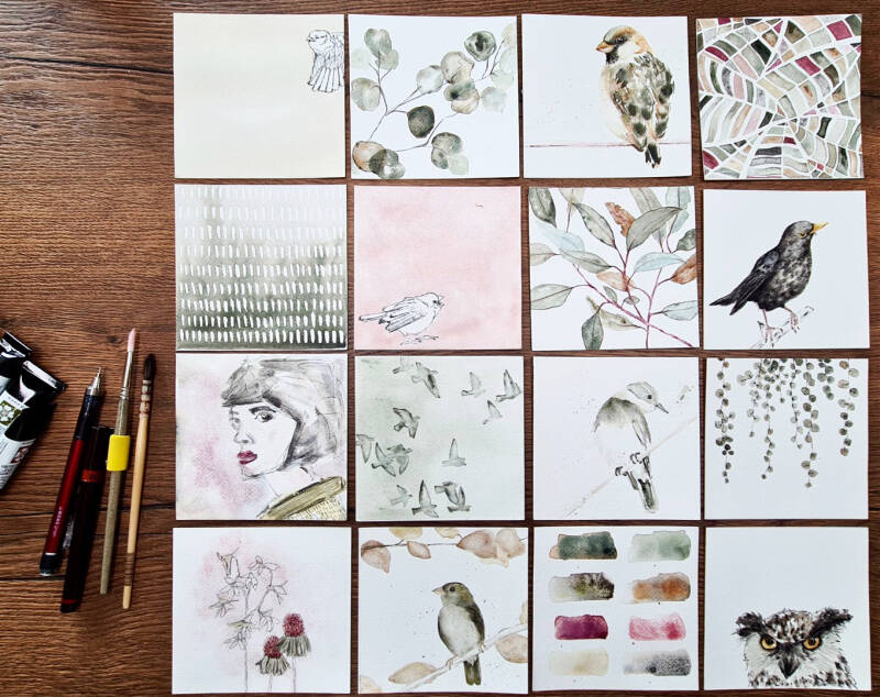 Nu op mijn werktafel: het begin van wat één kunstwerk moet worden, bestaande uit 50 losse aquarellen van elk 12 x 12 cm. Dit bericht wordt dus vervolgd! Op de foto rechts is mijn lieve 'assistent' te zien; hij houdt alles vanuit zijn mand in de gaten.