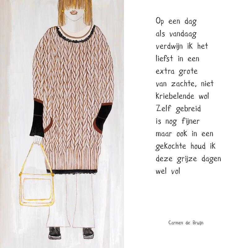Dit schilderij heb ik een poos geleden gemaakt, het hangt in de hal en telkens als ik erlangs loop, denk ik: wat een lekkere trui. Misschien moet ik maar eens aan de slag met de breinaalden.