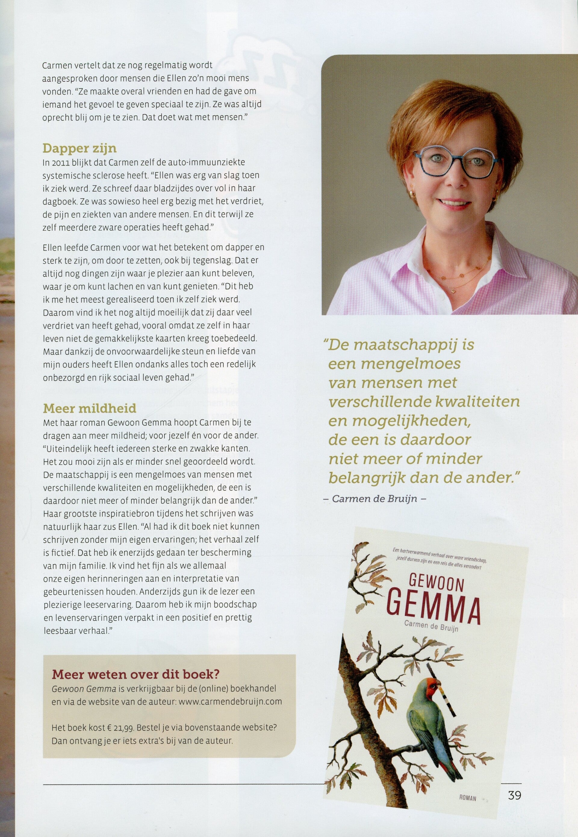 In Editie 4 van het magazine voor de Nederlandse Vereniging Williams Beuren Syndroom (NVWBS) staat een artikel over mijn roman Gewoon Gemma.